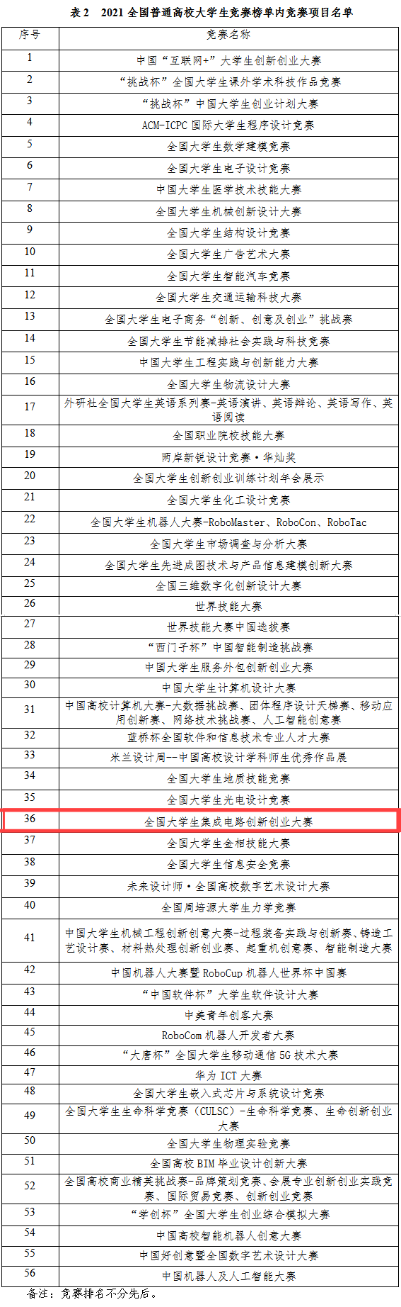 根据相关管理原则,基于竞赛数据采集、综合评价和专家委员会投票情况,确定1项赛事退出榜单,原56项竞赛继续纳入榜单(榜单内已有竞赛的子赛纳入但不计算项目数),2项赛事列入2022年重点观摩和考察项目。详见表2和表3。这是2021年版。