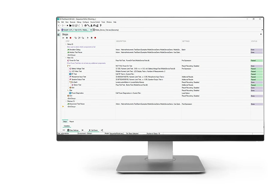 TestStand是一款应用软件,旨在帮助工程师快速开发强大的自动化测试和验证系统。您还可以通过在TestStand中开发测试序列来扩展系统的功能,这些测试序列可集成使用任何编程语言编写的代码模块。此外,在将测试系统部署到生产环境之前,您可以使用内置功能来分析和优化速度与并行性。TestStand还提供了可扩展插件,用于报告生成、数据库记录以及与其他系统的连接,可满足任意环境的需求。借助TestStand,您可以放心地部署测试系统,并获得生产级运行速度以及更高的吞吐量。